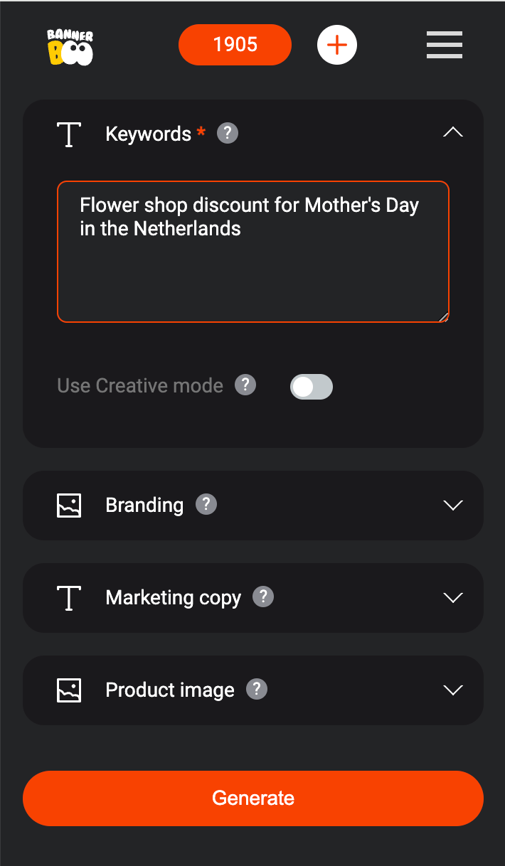 The most important and mandatory field is the "keywords" field. Enter a few words that describe your ad campaign and specify what kind of marketing texts and images you want. For example, "Summer sale for beachwear" or "New smartphone launch".