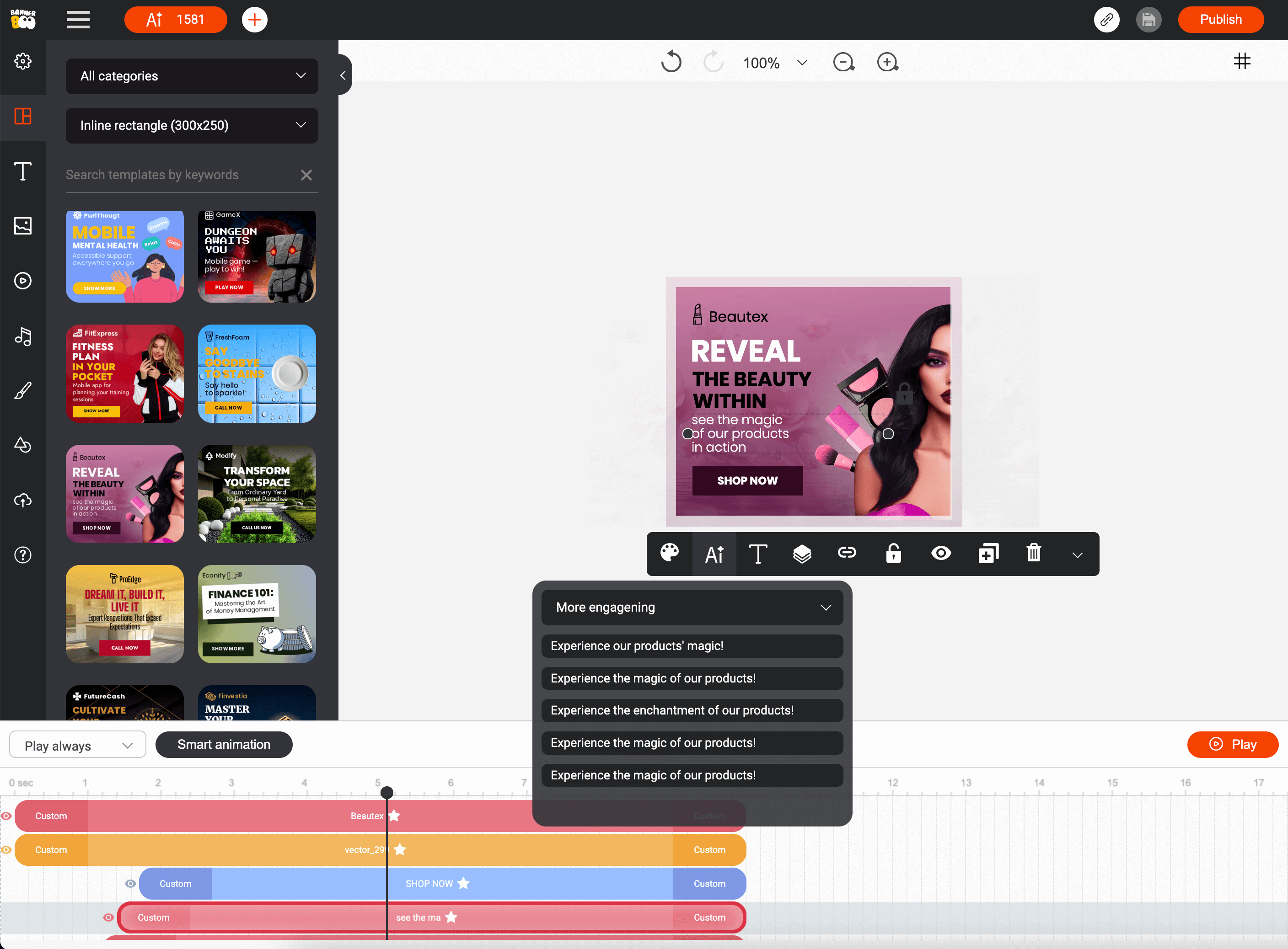 In the world of digital advertising, speed and creativity are your greatest advantages. To help you create faster and scale smarter, we’ve integrated a powerful suite of AI tools directly into the BannerBoo editor. Now, you can generate text variations with just a few clicks.